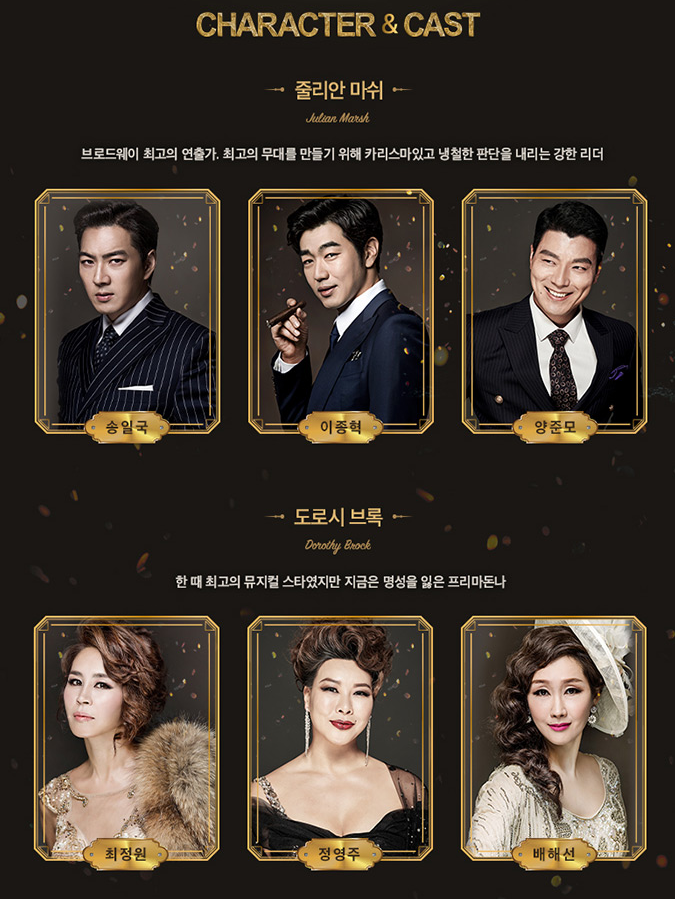 줄리안 마쉬 - 브로드 웨이 최고의 연출가. 최고의 무대를 만들어 내가 위해서 카리스마 넘치고 단호한 판단을 내리는 강한 리더 역할입니다.