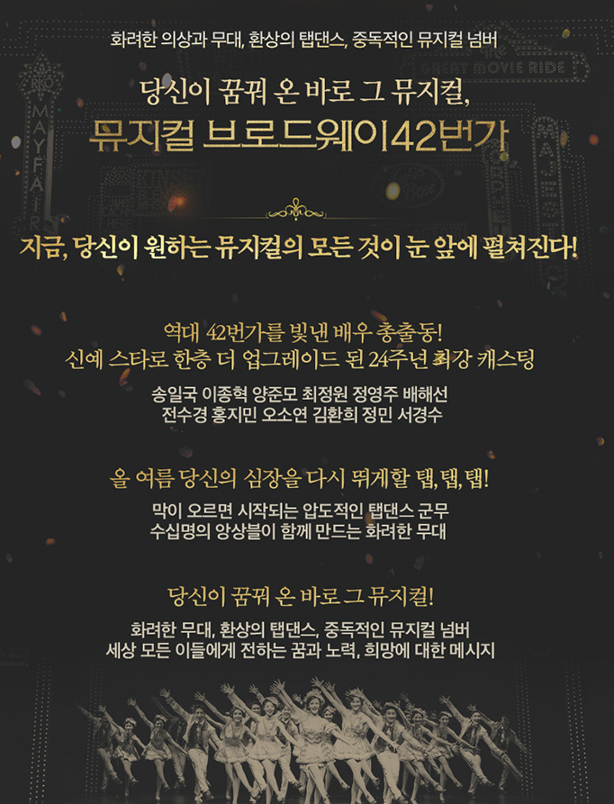"올여름 당신의 심장을 다시 뛰게 할 텝! 텝! 텝"이라는 찬사를 받은 뮤지컬 브로드웨이 42번가는 탭댄스가 가장 눈에 띄는 작품입니다.