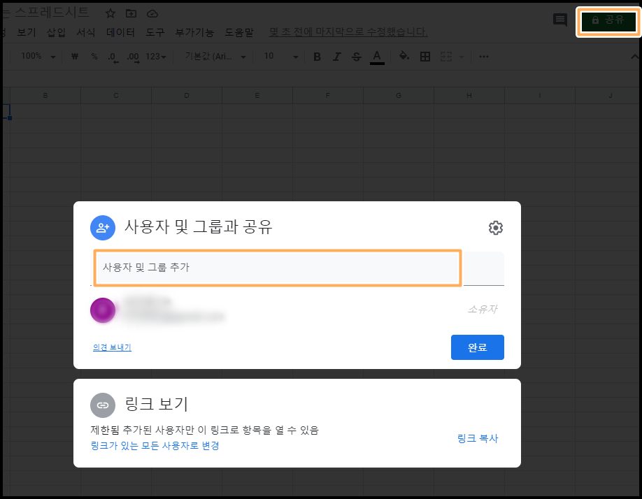 작업 중이던 문서의 오른쪽 상단에 있는 공유 버튼을 누르면 위와 같은 창이 나타납니다.